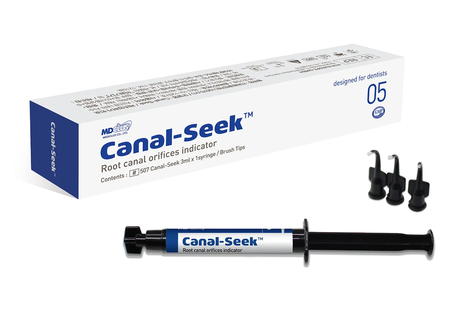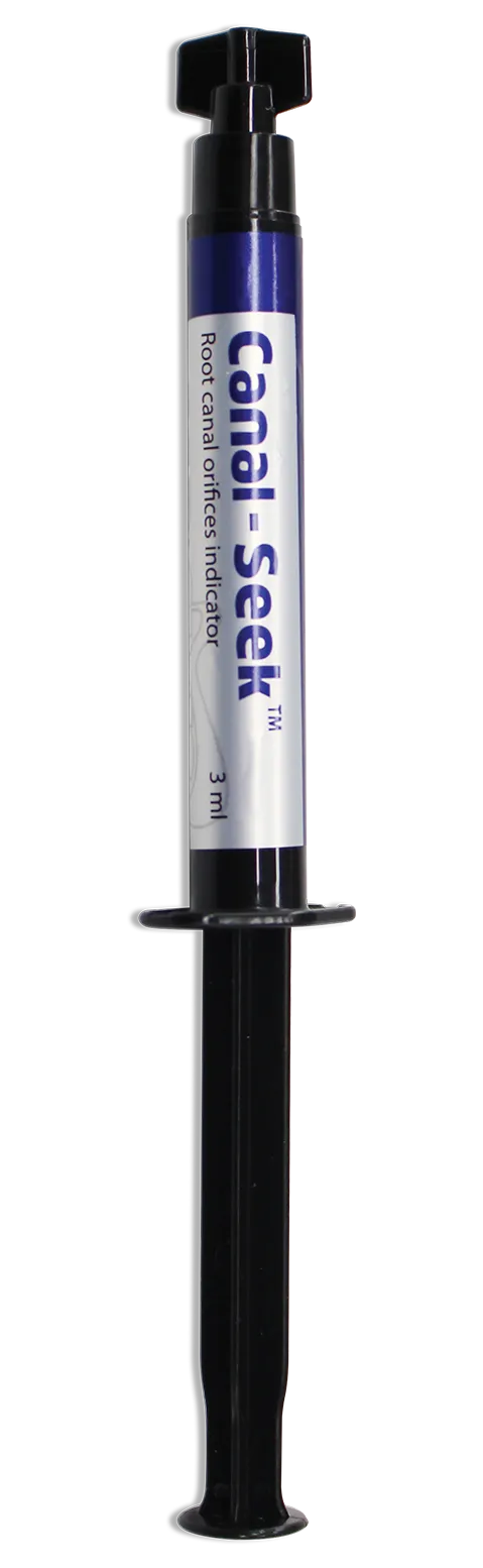 Le colorant bleu contenu dans le produit pénètre dans les orifices du canal radiculaire et les colore en bleu, ce qui facilite la localisation du canal radiculaire principal et la détection des fissures.